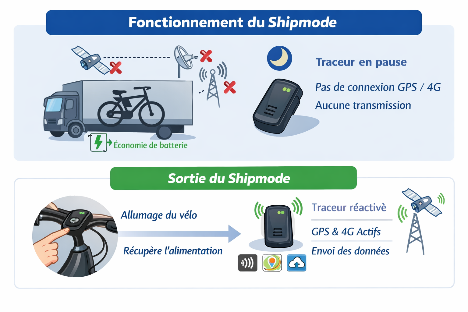 Conseil : Activez le Shipmode lorsque vous transportez plusieurs vélos (par exemple dans un camion ou un conteneur) afin d’éviter des remontées de données inutiles.